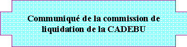La Commission de liquidation de la CADEBU informe les débiteurs de l'ex-CADEBU qu'ils devront continuer à payer leurs dettes par le biais des comptes N° 1120.001. 01 et 1120/001, tous ouverts à la BRB au nom de la CADEBU en liquidation.